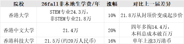 港大比特币支付的热度还未消退,港校学费暴涨的消息又给申请者泼了 “冷水”。2026fall 香港三大名校(港大、港中文、港科大)学费集体上涨,涨幅堪称 “史诗级”;与此同时,申请时间线也集体前移,开启 “抢人模式”。