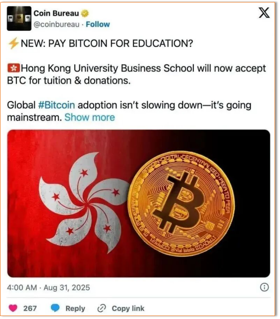 港大商学院的金融科技硕士项目,早已开设区块链智能合约开发课程,学生甚至能参与香港金融管理局的央行数字货币(CBDC)项目。让学生用比特币交学费,本质是将课堂知识与实际场景结合,打造 “实战演练” 的机会。