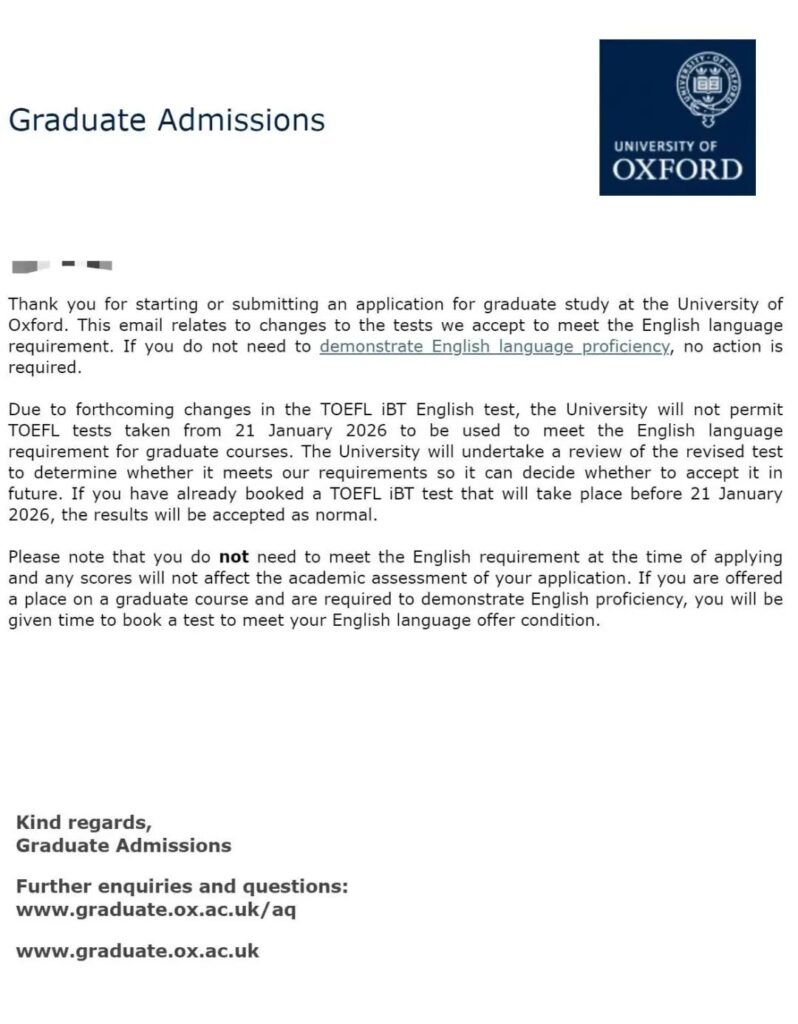 牛津大学官方邮件与官网入学语言测试 要求正式宣布:自2026年1月21日起,不再接受新版TOEFL iBT成绩作为研究生课程语言能力证明。