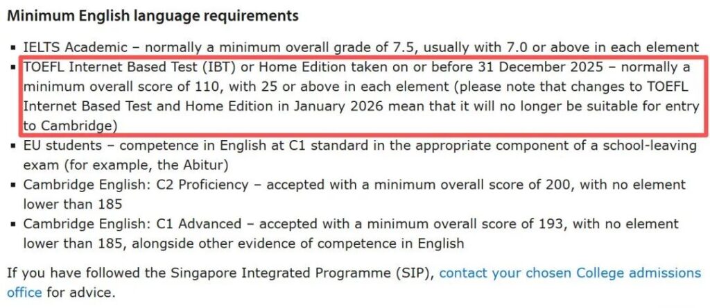 剑桥同样如此:更新官网国际学生本科申请要求,其中语言成绩明确要求:2025年12月31日之前考的托福成绩可以用(满足110+,单项25的要求);2026年1月之后的托福成绩将不能再用于剑桥申请。