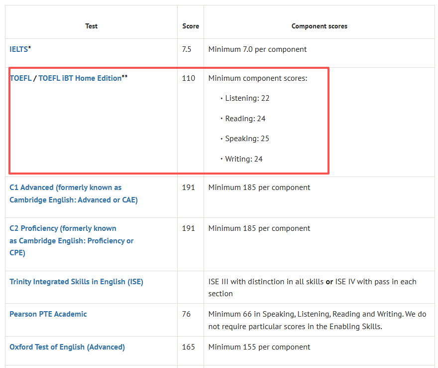 托福网考(含家庭版和纸笔版)都接受,须单次考试达标;成绩有效期为课程开始(9月1日)前2年。