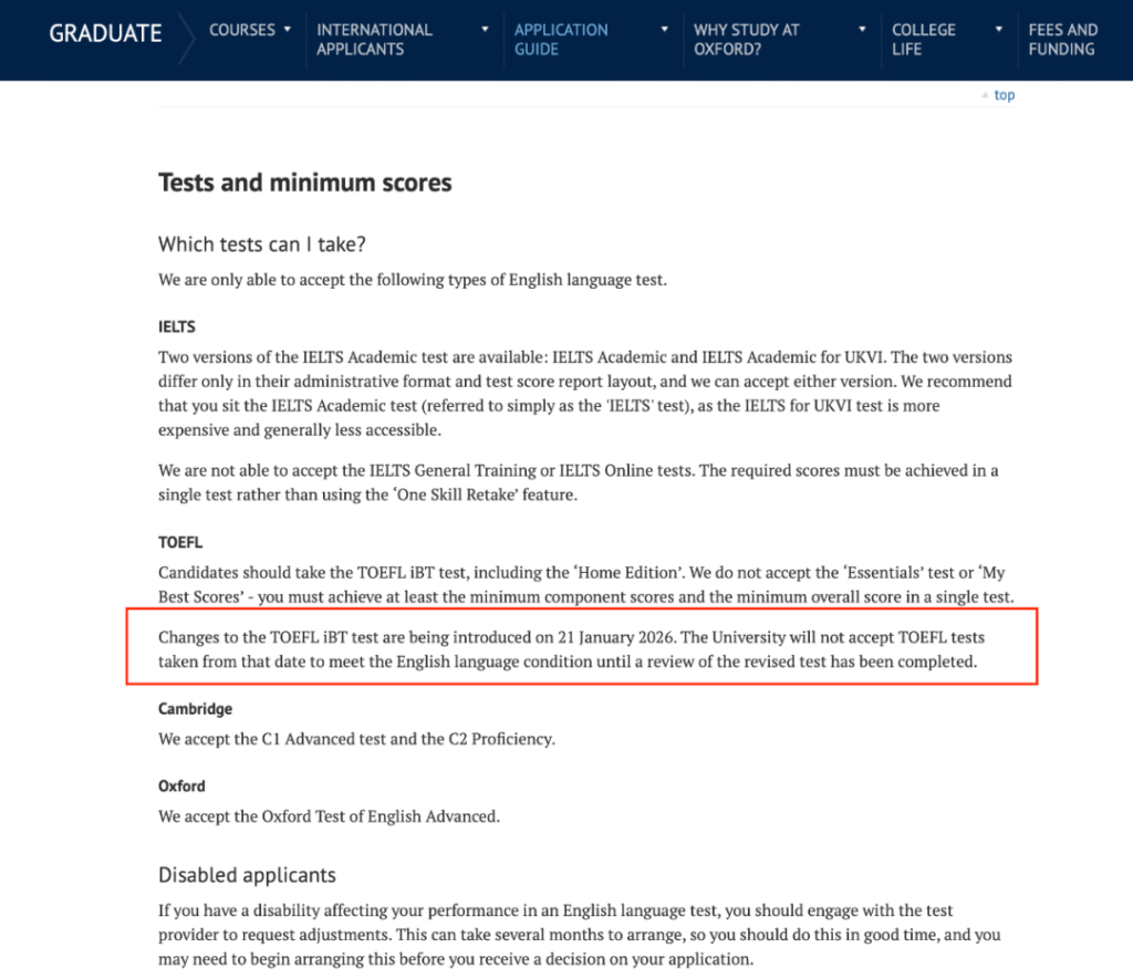 牛津给出了明确的时间线:自2026年1月21日起,牛津大学不再接受新版托福(TOEFL iBT)成绩作为研究生课程的语言能力证明。此前(2026年1月21日前)考出的托福成绩仍可正常用于申请。