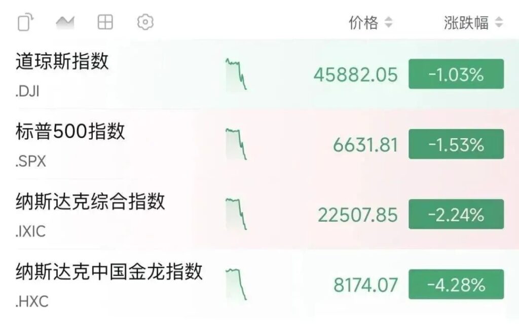 道琼斯指数跌超1%,标普500指数暴跌1.53%,纳斯达克指数重挫2.24%创下近期单日最大跌幅。