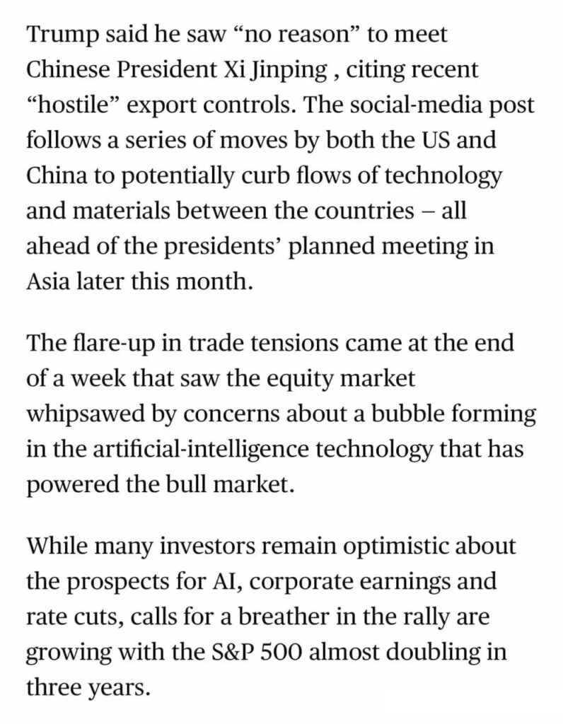 在Truth Social上,特朗普发表长文,指责中国对稀土出口实施管制是“极度敌对”行为威胁对华加征100%关税,并取消原定于两周后在APEC峰会举行的中美领导人会晤。