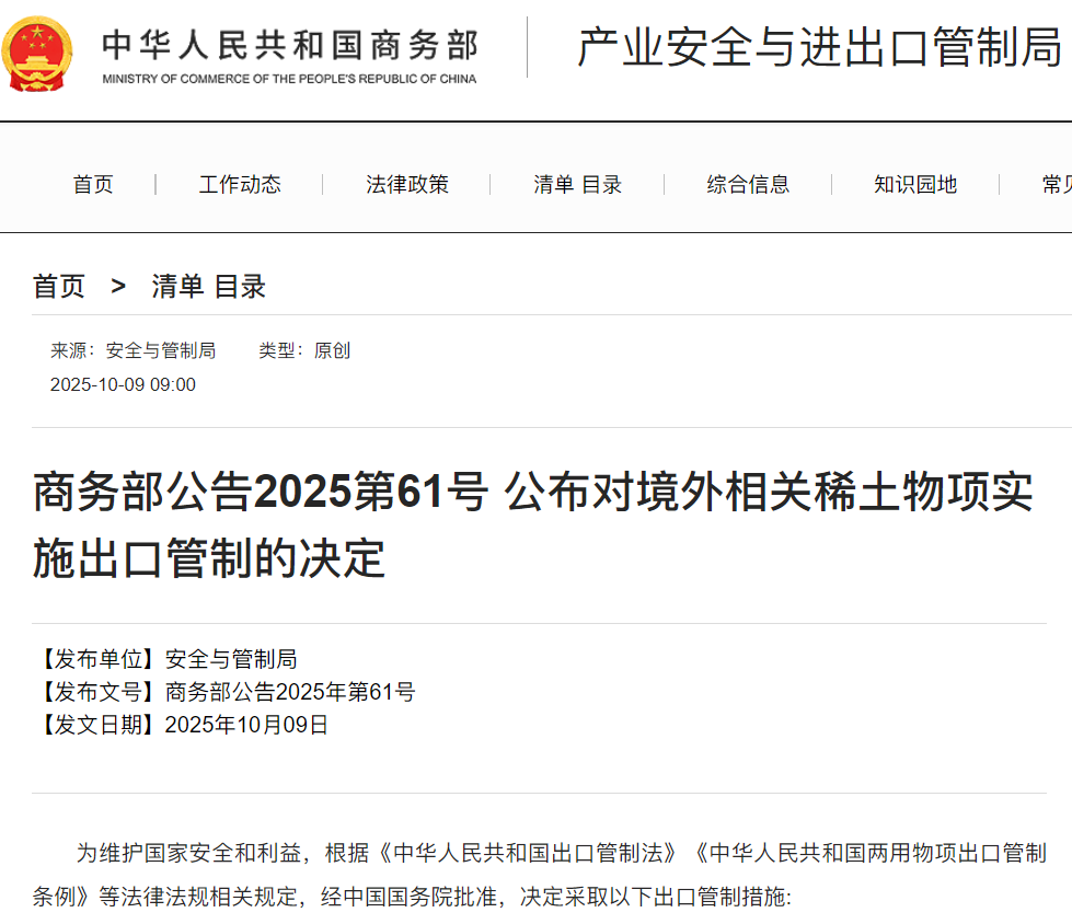 这场风暴的起点是中国商务部于10月9日发布的稀土出口管制公告。根据新规,稀土及相关技术、生产线的出口需获得商务部许可,特别是军事用途、大规模杀伤性武器等相关申请一律不予许可
