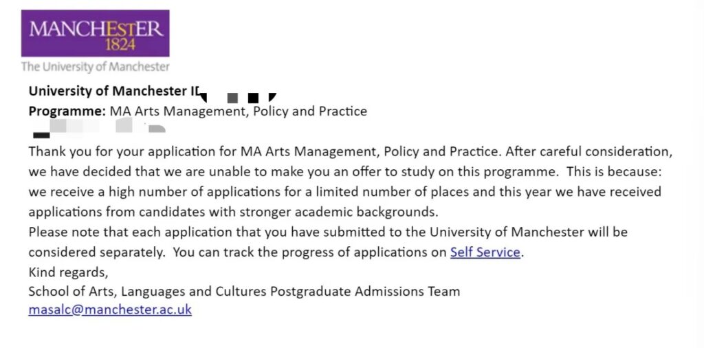 曼大不少专业虽然写着接受跨申,但对核心课程有隐形要求。还有拒信里写:“你的成绩单里相关课程不够丰富。”这些细节官网上往往不写明,如果没提前了解,很容易踩坑。想申金融?你的经济学、统计学成绩会被单独拎出来放大检视。“相关背景”不再是笼统的专业名称,而是精确到课程内容。