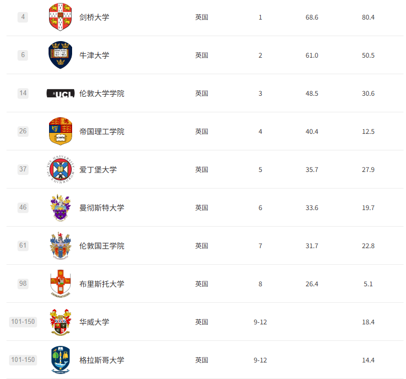 今年的榜单尤其刺激,英国UCL反超IC,KCL下跌,美国藤校大毛跑到300+,华大升至第17,中国清华大学更是历史性地冲进全球前20!
