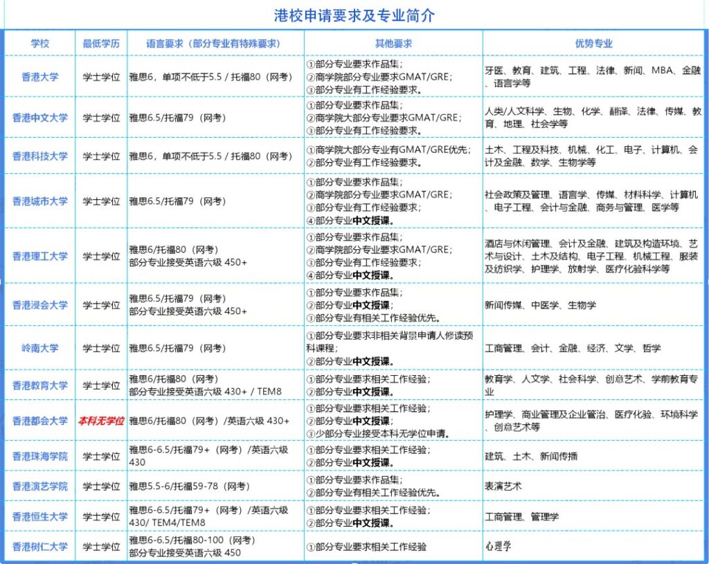 香港12所大学研究生申请要求