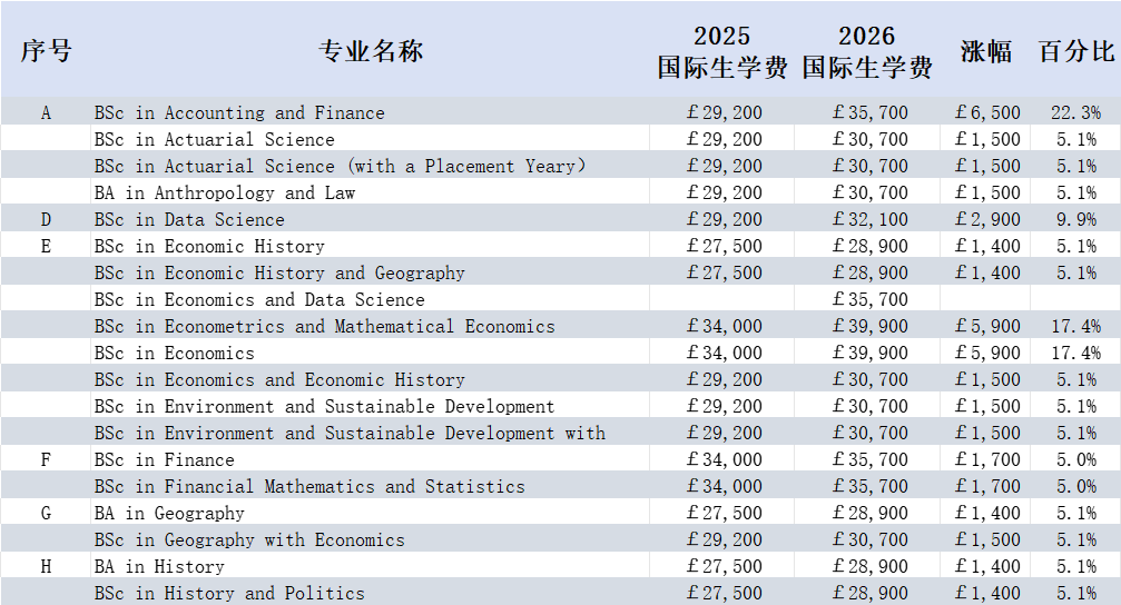 26fallLSE 学费涨幅 5.1% 档的专业,涵盖社会科学(如人类学与法律、地理、历史等)、经济相关(如经济学与经济史、环境与可持续发展等)、国际关系与政治(如国际关系、国际社会与公共政策等)多领域。
