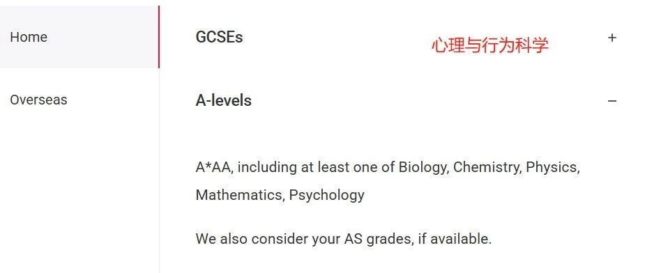 A-level:A*AA,需包含生物、化学、物理、数学、心理学中的至少一门,参考 AS 成绩(如有);