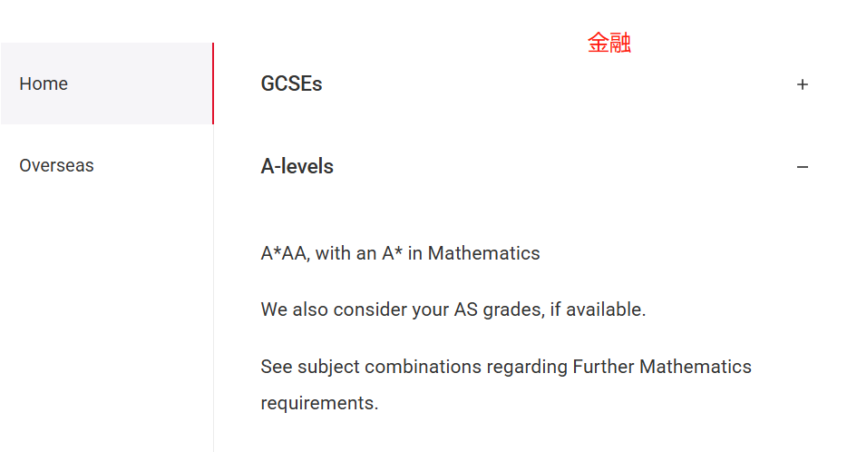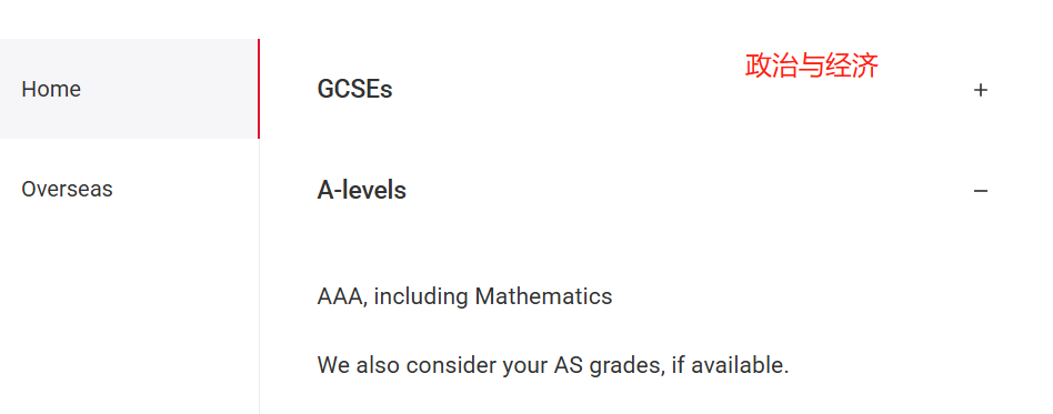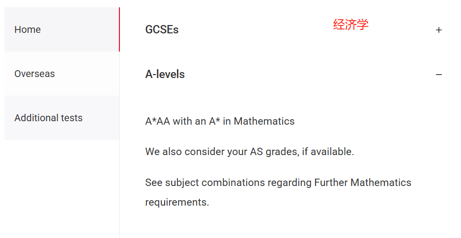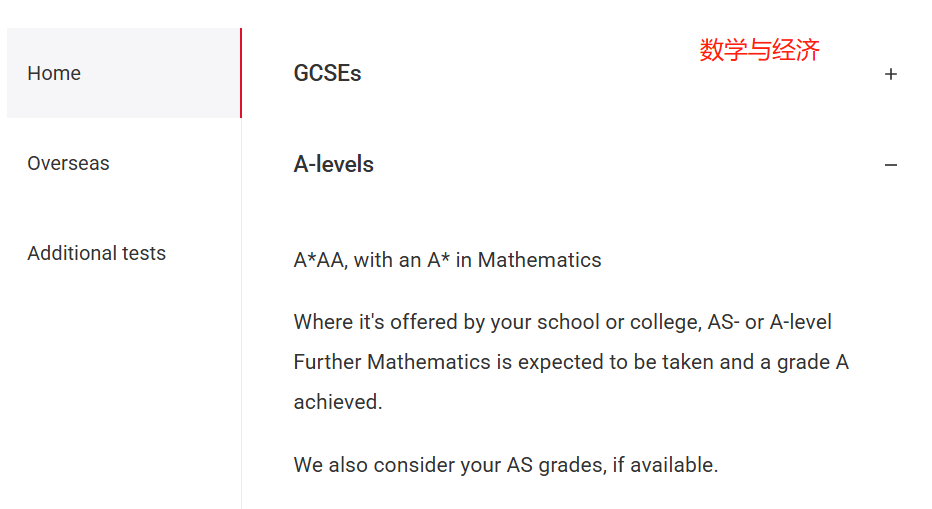 A-level:A*AA,数学需 A*;学校开设的话,需修 AS 或 A-level 进阶数学且获 A,参考 AS 成绩(如有);