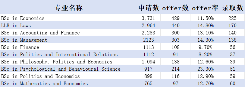 LSE 24fall 申请热门专业集中在 经济(3731份申请数)、法律(2964份申请数)、会计金融(2283份申请数)等,多为经济、商科、法律类。