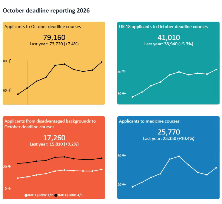数据显示,有41,010名英国18岁青少年申请了医学、牙科、兽医课程以及剑桥和牛津大学的课程,高于去年周期的38,940人(增长5.3%)。这超过了18岁人口的4.5%增长。
